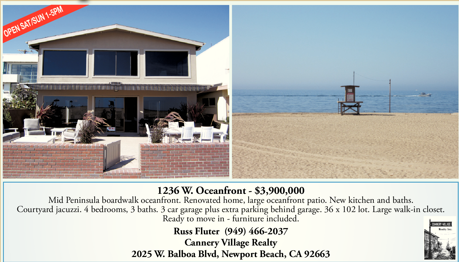 1236 W. Oceanfront - $3,900,000 Mid Peninsula boardwalk oceanfront. Renovated home, large oceanfront patio. New kitchen and baths. Courtyard jacuzzi. 4 bedrooms, 3 baths. 3 car garage plus extra parking behind garage. 36 x 102 lot. Large walk-in closet. Ready to move in - furniture included. Russ Fluter (949) 466-2037 Cannery Village Realty 2025 W. Balboa Blvd, Newport Beach, CA 92663