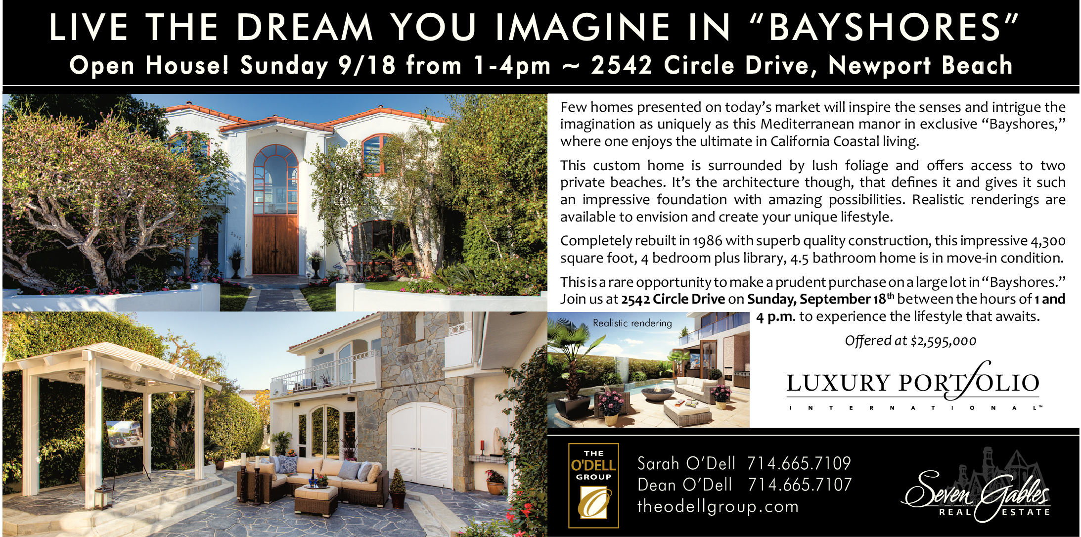 LIVE THE DREAM YOU IMAGINE IN “BAYSHORES” Open House! Sunday 9/18 from 1-4pm ~ 2542 Circle Drive, Newport Beach Few homes presented on today’s market will inspire the senses and intrigue the imagination as uniquely as this Mediterranean manor in exclusive “Bayshores,” where one enjoys the ultimate in California Coastal living. This custom home is surrounded by lush foliage and offers access to two private beaches. It’s the architecture though, that defines it and gives it such an impressive foundation with amazing possibilities. Realistic renderings are available to envision and create your unique lifestyle. Completely rebuilt in 1986 with superb quality construction, this impressive 4,300 square foot, 4 bedroom plus library, 4.5 bathroom home is in move-in condition. This is a rare opportunity to make a prudent purchase on a large lot in “Bayshores.” Join us at 2542 Circle Drive on Sunday, September 18 th between the hours of 1and Realistic rendering 4 p.m. to experience the lifestyle that awaits. Offered at $2,595,000 Sarah O’Dell 714.665.7109 Dean O’Dell 714.665.7107 theodellgroup.com R E A L E S TAT E