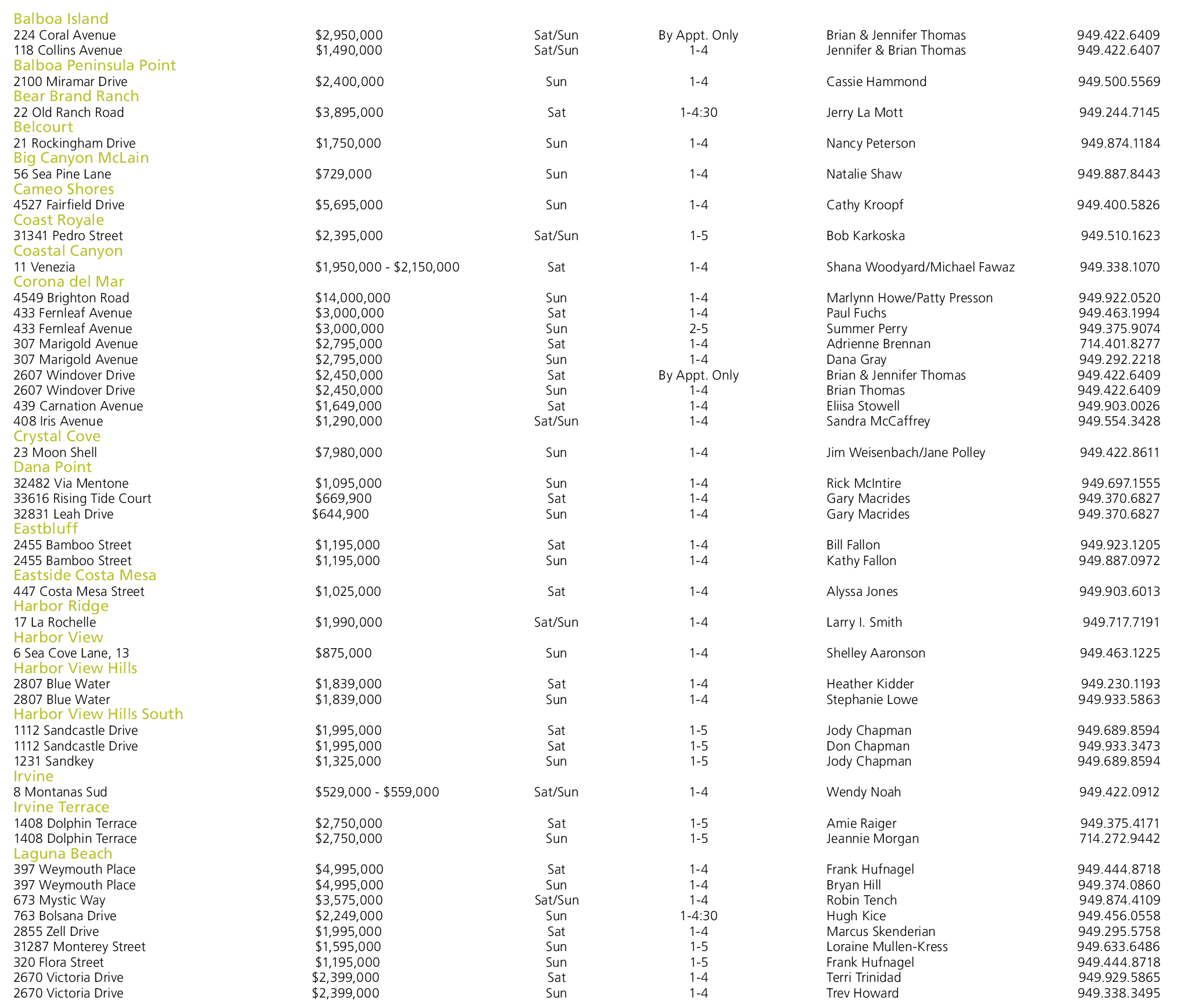 Balboa Island 224 Coral Avenue $2,950,000 Sat/Sun By Appt. Only Brian & Jennifer Thomas 949.422.6409 118 Collins Avenue $1,490,000 Sat/Sun 1-4 Jennifer & Brian Thomas 949.422.6407 Balboa Peninsula Point 2100 Miramar Drive $2,400,000 Sun 1-4 Cassie Hammond 949.500.5569 Bear Brand Ranch 22 Old Ranch Road $3,895,000 Sat 1-4:30 Jerry La Mott 949.244.7145 Belcourt 21 Rockingham Drive $1,750,000 Sun 1-4 Nancy Peterson 949.874.1184 Big Canyon McLain 56 Sea Pine Lane $729,000 Sun 1-4 Natalie Shaw 949.887.8443 Cameo Shores 4527 Fairfield Drive $5,695,000 Sun 1-4 Cathy Kroopf 949.400.5826 Coast Royale 31341 Pedro Street $2,395,000 Sat/Sun 1-5 Bob Karkoska 949.510.1623 Coastal Canyon 11 Venezia $1,950,000 - $2,150,000 Sat 1-4 Shana Woodyard/Michael Fawaz 949.338.1070 Corona del Mar 4549 Brighton Road $14,000,000 Sun 1-4 Marlynn Howe/Patty Presson 949.922.0520 433 Fernleaf Avenue $3,000,000 Sat 1-4 Paul Fuchs 949.463.1994 433 Fernleaf Avenue $3,000,000 Sun 2-5 Summer Perry 949.375.9074 307 Marigold Avenue $2,795,000 Sat 1-4 Adrienne Brennan 714.401.8277 307 Marigold Avenue $2,795,000 Sun 1-4 Dana Gray 949.292.2218 2607 Windover Drive $2,450,000 Sat By Appt. Only Brian & Jennifer Thomas 949.422.6409 2607 Windover Drive $2,450,000 Sun 1-4 Brian Thomas 949.422.6409 439 Carnation Avenue $1,649,000 Sat 1-4 Eliisa Stowell 949.903.0026 408 Iris Avenue $1,290,000 Sat/Sun 1-4 Sandra McCaffrey 949.554.3428 Crystal Cove 23 Moon Shell $7,980,000 Sun 1-4 Jim Weisenbach/Jane Polley 949.422.8611 Dana Point 32482 Via Mentone $1,095,000 Sun 1-4 Rick McIntire 949.697.1555 33616 Rising Tide Court $669,900 Sat 1-4 Gary Macrides 949.370.6827 32831 Leah Drive $644,900 Sun 1-4 Gary Macrides 949.370.6827 Eastbluff 2455 Bamboo Street $1,195,000 Sat 1-4 Bill Fallon 949.923.1205 2455 Bamboo Street $1,195,000 Sun 1-4 Kathy Fallon 949.887.0972 Eastside Costa Mesa 447 Costa Mesa Street $1,025,000 Sat 1-4 Alyssa Jones 949.903.6013 Harbor Ridge 17 La Rochelle $1,990,000 Sat/Sun 1-4 Larry I. Smith 949.717.7191 Harbor View 6 Sea Cove Lane, 13 $875,000 Sun 1-4 Shelley Aaronson 949.463.1225 Harbor View Hills 2807 Blue Water $1,839,000 Sat 1-4 Heather Kidder 949.230.1193 2807 Blue Water $1,839,000 Sun 1-4 Stephanie Lowe 949.933.5863 Harbor View Hills South 1112 Sandcastle Drive $1,995,000 Sat 1-5 Jody Chapman 949.689.8594 1112 Sandcastle Drive $1,995,000 Sat 1-5 Don Chapman 949.933.3473 1231 Sandkey $1,325,000 Sun 1-5 Jody Chapman 949.689.8594 Irvine 8 Montanas Sud $529,000 - $559,000 Sat/Sun 1-4 Wendy Noah 949.422.0912 Irvine Terrace 1408 Dolphin Terrace $2,750,000 Sat 1-5 Amie Raiger 949.375.4171 1408 Dolphin Terrace $2,750,000 Sun 1-5 Jeannie Morgan 714.272.9442 Laguna Beach 397 Weymouth Place $4,995,000 Sat 1-4 Frank Hufnagel 949.444.8718 397 Weymouth Place $4,995,000 Sun 1-4 Bryan Hill 949.374.0860 673 Mystic Way $3,575,000 Sat/Sun 1-4 Robin Tench 949.874.4109 763 Bolsana Drive $2,249,000 Sun 1-4:30 Hugh Kice 949.456.0558 2855 Zell Drive $1,995,000 Sat 1-4 Marcus Skenderian 949.295.5758 31287 Monterey Street $1,595,000 Sun 1-5 Loraine Mullen-Kress 949.633.6486 320 Flora Street $1,195,000 Sun 1-5 Frank Hufnagel 949.444.8718 2670 Victoria Drive $2,399,000 Sat 1-4 Terri Trinidad 949.929.5865 2670 Victoria Drive $2,399,000 Sun 1-4 Trev Howard 949.338.3495