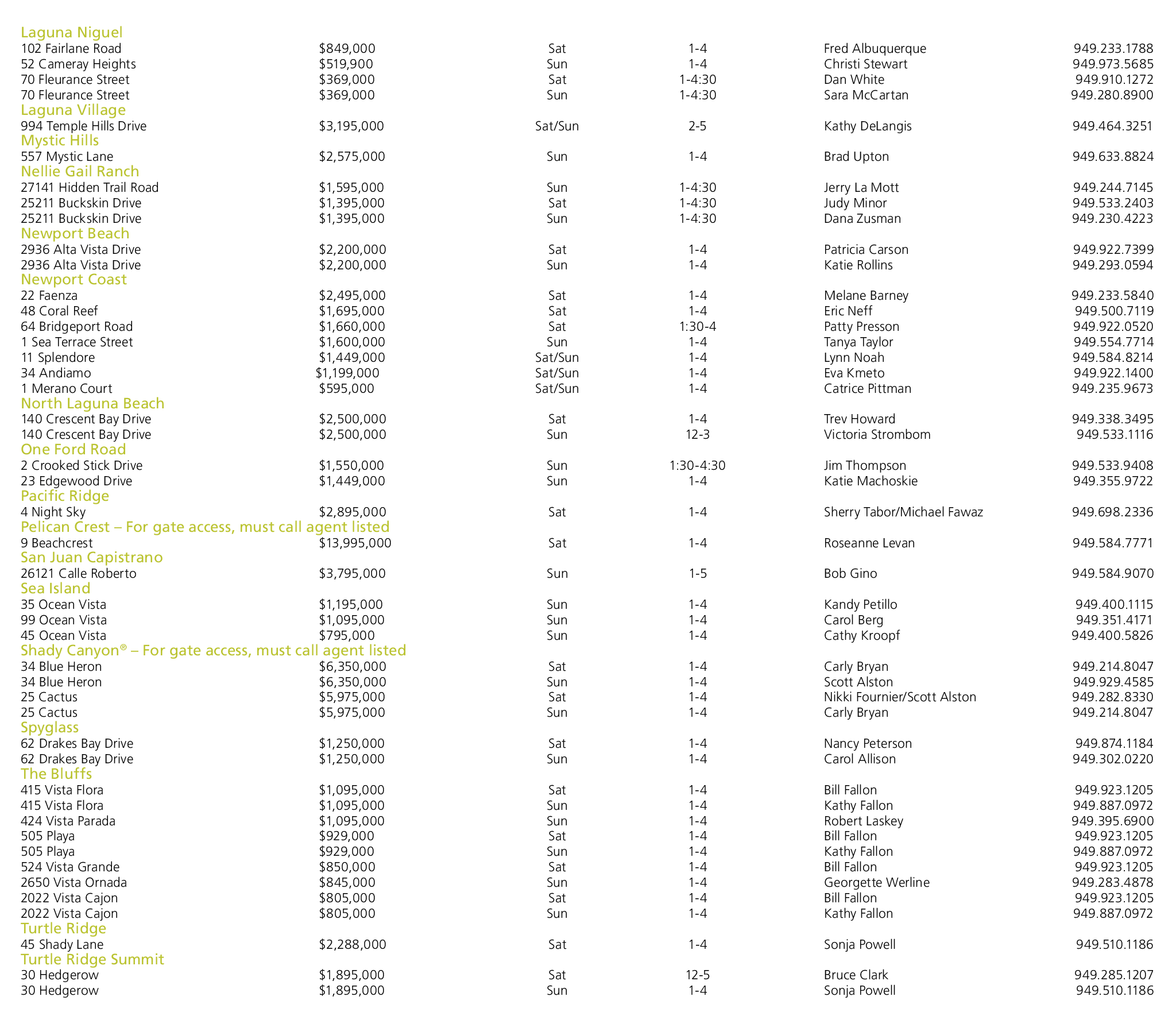 Laguna Niguel 102 Fairlane Road $849,000 Sat 1-4 Fred Albuquerque 949.233.1788 52 Cameray Heights $519,900 Sun 1-4 Christi Stewart 949.973.5685 70 Fleurance Street $369,000 Sat 1-4:30 Dan White 949.910.1272 70 Fleurance Street $369,000 Sun 1-4:30 Sara McCartan 949.280.8900 Laguna Village 994 Temple Hills Drive $3,195,000 Sat/Sun 2-5 Kathy DeLangis 949.464.3251 Mystic Hills 557 Mystic Lane $2,575,000 Sun 1-4 Brad Upton 949.633.8824 Nellie Gail Ranch 27141 Hidden Trail Road $1,595,000 Sun 1-4:30 Jerry La Mott 949.244.7145 25211 Buckskin Drive $1,395,000 Sat 1-4:30 Judy Minor 949.533.2403 25211 Buckskin Drive $1,395,000 Sun 1-4:30 Dana Zusman 949.230.4223 Newport Beach 2936 Alta Vista Drive $2,200,000 Sat 1-4 Patricia Carson 949.922.7399 2936 Alta Vista Drive $2,200,000 Sun 1-4 Katie Rollins 949.293.0594 Newport Coast 22 Faenza $2,495,000 Sat 1-4 Melane Barney 949.233.5840 48 Coral Reef $1,695,000 Sat 1-4 Eric Neff 949.500.7119 64 Bridgeport Road $1,660,000 Sat 1:30-4 Patty Presson 949.922.0520 1 Sea Terrace Street $1,600,000 Sun 1-4 Tanya Taylor 949.554.7714 11 Splendore $1,449,000 Sat/Sun 1-4 Lynn Noah 949.584.8214 34 Andiamo $1,199,000 Sat/Sun 1-4 Eva Kmeto 949.922.1400 1 Merano Court $595,000 Sat/Sun 1-4 Catrice Pittman 949.235.9673 North Laguna Beach 140 Crescent Bay Drive $2,500,000 Sat 1-4 Trev Howard 949.338.3495 140 Crescent Bay Drive $2,500,000 Sun 12-3 Victoria Strombom 949.533.1116 One Ford Road 2 Crooked Stick Drive $1,550,000 Sun 1:30-4:30 Jim Thompson 949.533.9408 23 Edgewood Drive $1,449,000 Sun 1-4 Katie Machoskie 949.355.9722 Pacific Ridge 4 Night Sky $2,895,000 Sat 1-4 Sherry Tabor/Michael Fawaz 949.698.2336 Pelican Crest – For gate access, must call agent listed 9 Beachcrest $13,995,000 Sat 1-4 Roseanne Levan 949.584.7771 San Juan Capistrano 26121 Calle Roberto $3,795,000 Sun 1-5 Bob Gino 949.584.9070 Sea Island 35 Ocean Vista $1,195,000 Sun 1-4 Kandy Petillo 949.400.1115 99 Ocean Vista $1,095,000 Sun 1-4 Carol Berg 949.351.4171 45 Ocean Vista $795,000 Sun 1-4 Cathy Kroopf 949.400.5826 Shady Canyon ® – For gate access, must call agent listed 34 Blue Heron $6,350,000 Sat 1-4 Carly Bryan 949.214.8047 34 Blue Heron $6,350,000 Sun 1-4 Scott Alston 949.929.4585 25 Cactus $5,975,000 Sat 1-4 Nikki Fournier/Scott Alston 949.282.8330 25 Cactus $5,975,000 Sun 1-4 Carly Bryan 949.214.8047 Spyglass 62 Drakes Bay Drive $1,250,000 Sat 1-4 Nancy Peterson 949.874.1184 62 Drakes Bay Drive $1,250,000 Sun 1-4 Carol Allison 949.302.0220 The Bluffs 415 Vista Flora $1,095,000 Sat 1-4 Bill Fallon 949.923.1205 415 Vista Flora $1,095,000 Sun 1-4 Kathy Fallon 949.887.0972 424 Vista Parada $1,095,000 Sun 1-4 Robert Laskey 949.395.6900 505 Playa $929,000 Sat 1-4 Bill Fallon 949.923.1205 505 Playa $929,000 Sun 1-4 Kathy Fallon 949.887.0972 524 Vista Grande $850,000 Sat 1-4 Bill Fallon 949.923.1205 2650 Vista Ornada $845,000 Sun 1-4 Georgette Werline 949.283.4878 2022 Vista Cajon $805,000 Sat 1-4 Bill Fallon 949.923.1205 2022 Vista Cajon $805,000 Sun 1-4 Kathy Fallon 949.887.0972 Turtle Ridge 45 Shady Lane $2,288,000 Sat 1-4 Sonja Powell 949.510.1186 Turtle Ridge Summit 30 Hedgerow $1,895,000 Sat 12-5 Bruce Clark 949.285.1207 30 Hedgerow $1,895,000 Sun 1-4 Sonja Powell 949.510.1186