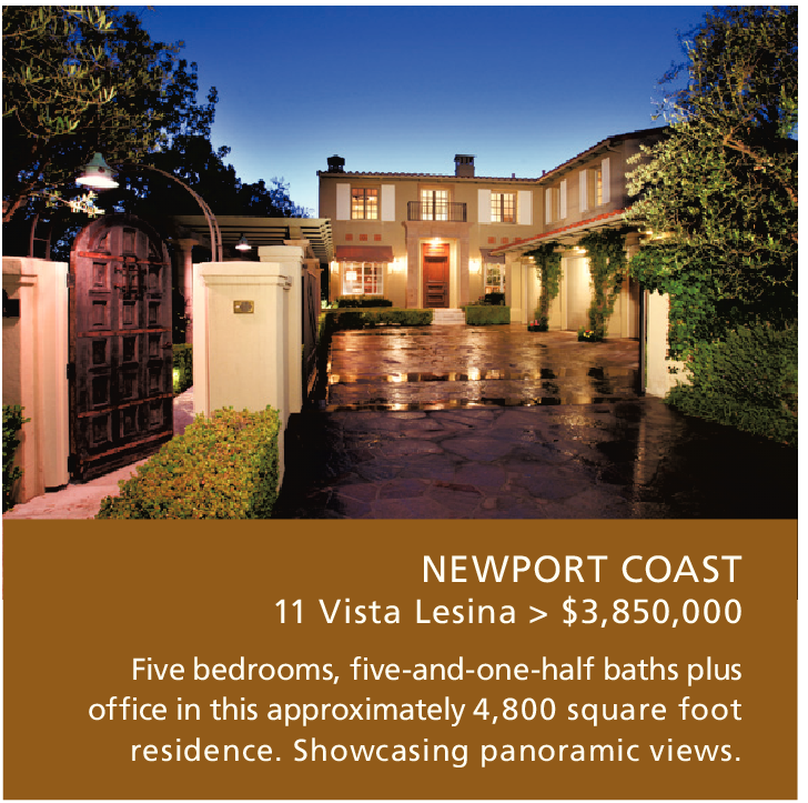 NEWPORT COAST 11 Vista Lesina > $3,850,000 Five bedrooms, five-and-one-half baths plus office in this approximately 4,800 square foot residence. Showcasing panoramic views.