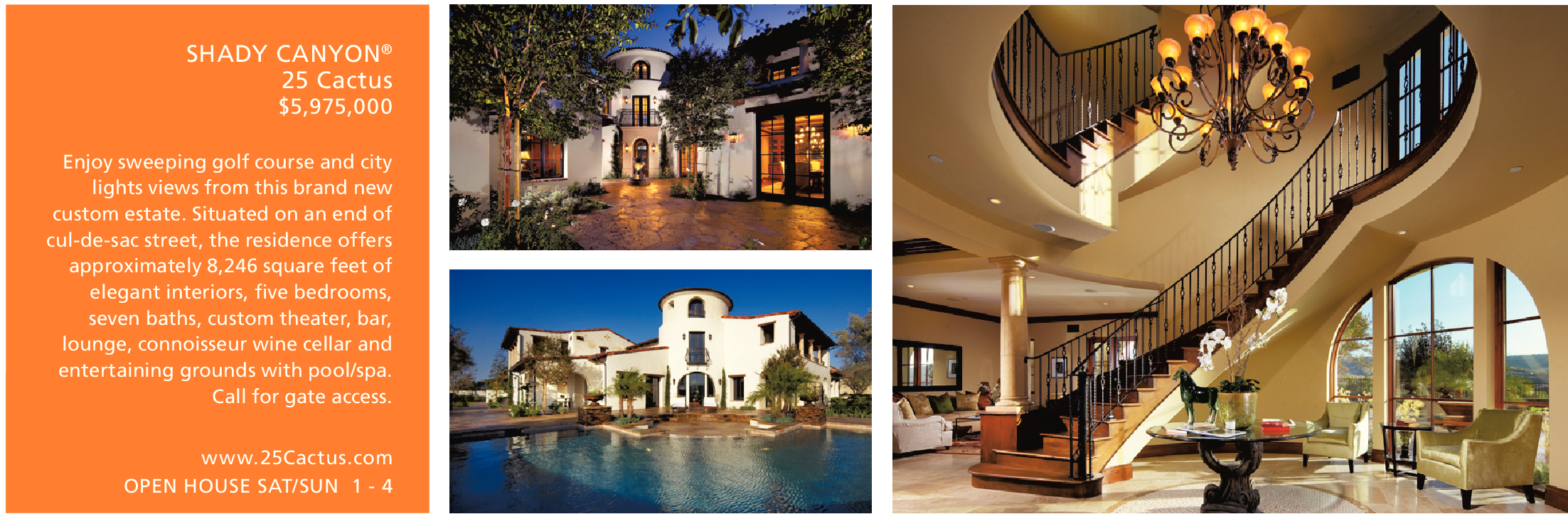 SHADY CANYON ® 25 Cactus $5,975,000 Enjoy sweeping golf course and city lights views from this brand new custom estate. Situated on an end of cul-de-sac street, the residence offers approximately 8,246 square feet of elegant interiors, five bedrooms, seven baths, custom theater, bar, lounge, connoisseur wine cellar and entertaining grounds with pool/spa. Call for gate access. www.25Cactus.com OPEN HOUSE SAT/SUN 1 - 4