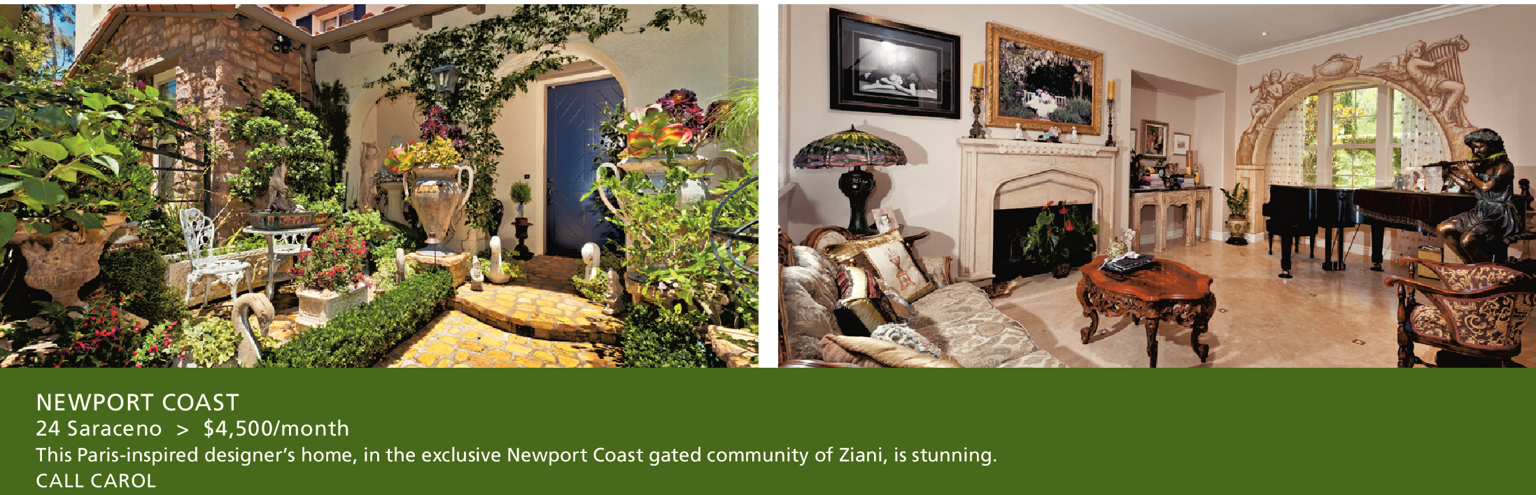 NEWPORT COAST 24 Saraceno > $4,500/month This Paris-inspired designer’s home, in the exclusive Newport Coast gated community of Ziani, is stunning. CALL CAROL