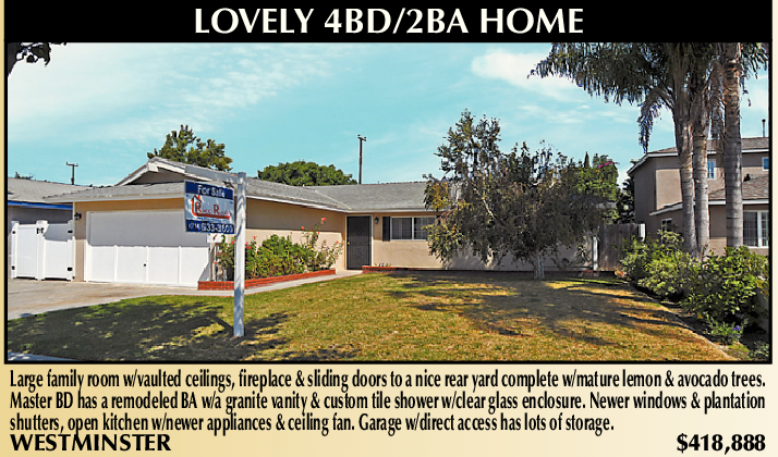 LOVELY 4BD/2BA HOME Large family room w/vaulted ceilings, fireplace & sliding doors to a nice rear yard complete w/mature lemon & avocado trees. Master BD has a remodeled BA w/a granite vanity & custom tile shower w/clear glass enclosure. Newer windows & plantation shutters, open kitchen w/newer appliances & ceiling fan. Garage w/direct access has lots of storage. WESTMINSTER $418,888