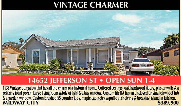 VINTAGE CHARMER 14652 JEFFERSON ST • OPEN SUN 1-4 1933 Vintage bungalow that has all the charm of a historical home. Coffered ceilings, oak hardwood floors, plaster walls & a relaxing front porch. Large living room w/lots of light & a bay window. Custom tile BA has an enclosed original claw foot tub & a garden window. Custom brushed SS counter tops, maple cabinetry w/pull out shelving & breakfast island in kitchen. MIDWAY CITY $389,900