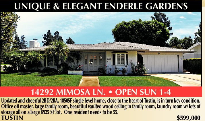 UNIQUE & ELEGANT ENDERLE GARDENS 14292 MIMOSA LN. • OPEN SUN 1-4 Updated and cheerful 2BD/2BA, 1850SF single level home, close to the heart of Tustin, is in turn key condition. Office off master, large family room, beautiful vaulted wood ceiling in family room, laundry room w/ lots of storage all on a large 8925 SF lot. One resident needs to be 55. TUSTIN $599,000
