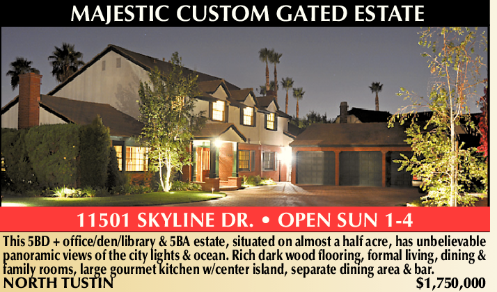 MAJESTIC CUSTOM GATED ESTATE 11501 SKYLINE DR. • OPEN SUN 1-4 This 5BD + office/den/library & 5BA estate, situated on almost a half acre, has unbelievable panoramic views of the city lights & ocean. Rich dark wood flooring, formal living, dining & family rooms, large gourmet kitchen w/center island, separate dining area & bar. NORTH TUSTIN $1,750,000
