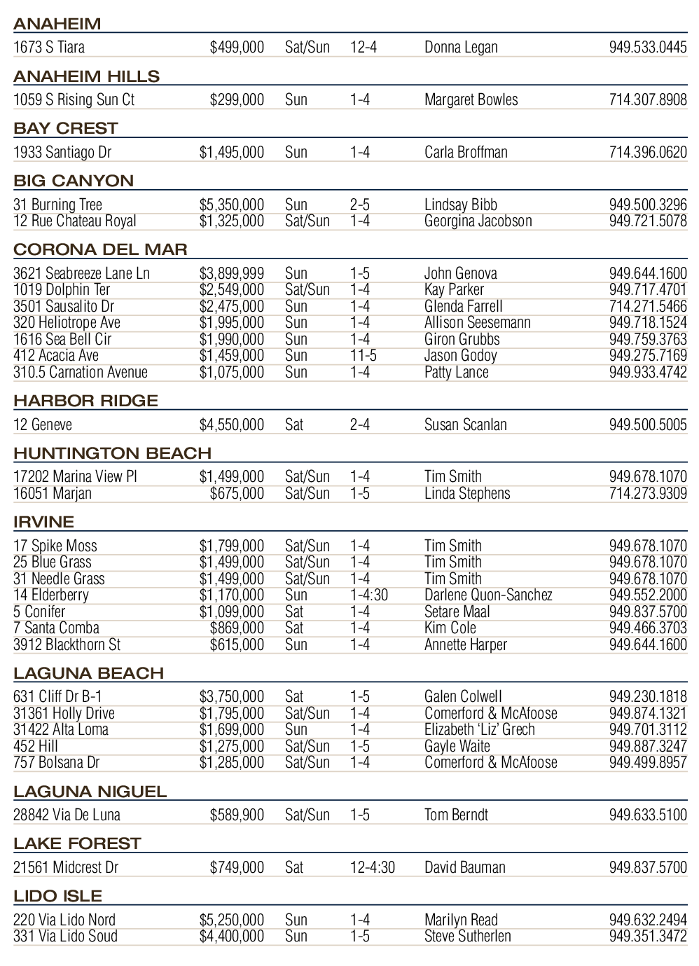 LAGUNA BEACH 631 Cliff Dr B-1 $3,750,000 Sat 1-5 Galen Colwell 949.230.1818 31361 Holly Drive $1,795,000 Sat/Sun 1-4 Comerford & McAfoose 949.874.1321 31422 Alta Loma $1,699,000 Sun 1-4 Elizabeth ‘Liz’ Grech 949.701.3112 452 Hill $1,275,000 Sat/Sun 1-5 Gayle Waite 949.887.3247 757 Bolsana Dr $1,285,000 Sat/Sun 1-4 Comerford & McAfoose 949.499.8957