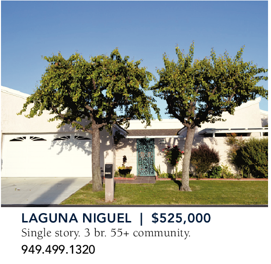 LAGUNA NIGUEL | $525,000 Single story. 3 br. 55+ community. 949.499.1320