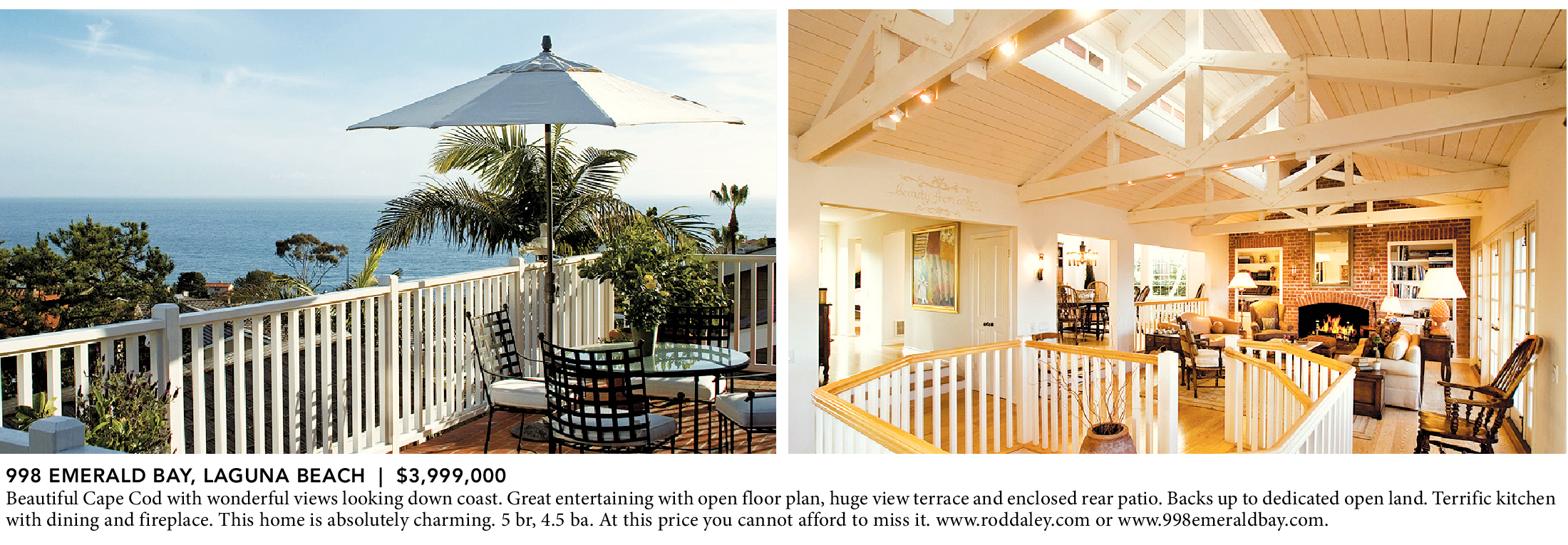 998 EMERALD BAY, LAGUNA BEACH | $3,999,000 Beautiful Cape Cod with wonderful views looking down coast. Great entertaining with open floor plan, huge view terrace and enclosed rear patio. Backs up to dedicated open land. Terrific kitchen with dining and fireplace. This home is absolutely charming. 5 br, 4.5 ba. At this price you cannot afford to miss it. www.roddaley.com or www.998emeraldbay.com.