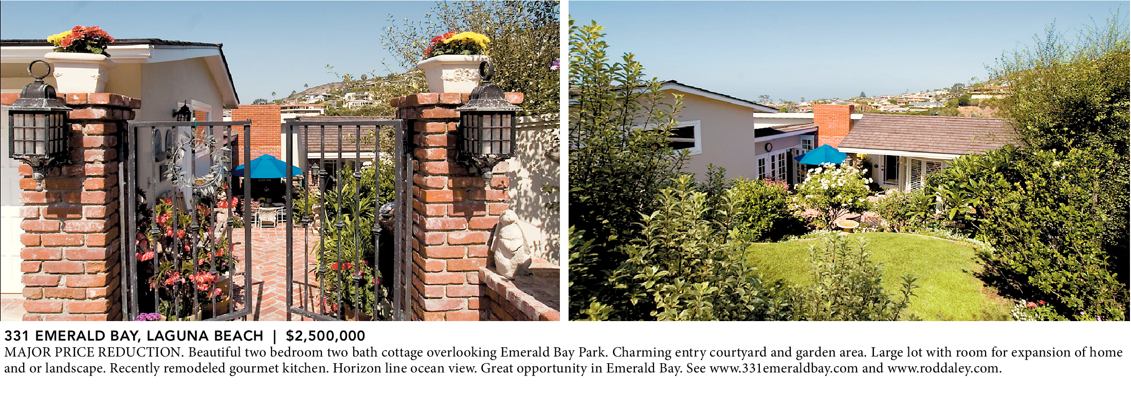 331 EMERALD BAY, LAGUNA BEACH | $2,500,000 MAJOR PRICE REDUCTION. Beautiful two bedroom two bath cottage overlooking Emerald Bay Park. Charming entry courtyard and garden area. Large lot with room for expansion of home and or landscape. Recently remodeled gourmet kitchen. Horizon line ocean view. Great opportunity in Emerald Bay. See www.331emeraldbay.com and www.roddaley.com.