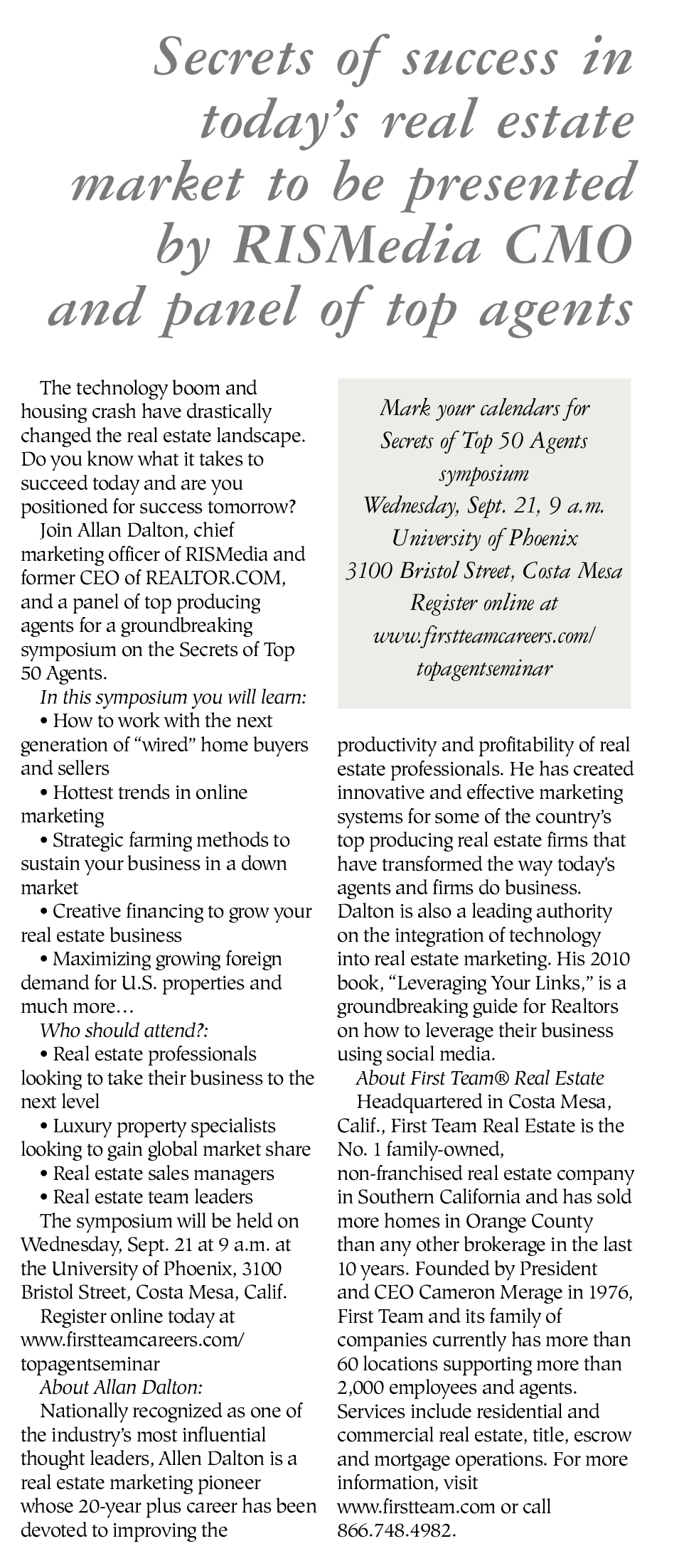 Register online today at www.firstteamcareers.com/ topagentseminar About Allan Dalton: Nationally recognized as one of the industry’s most influential thought leaders, Allen Dalton is a real estate marketing pioneer whose 20-year plus career has been devoted to improving the
