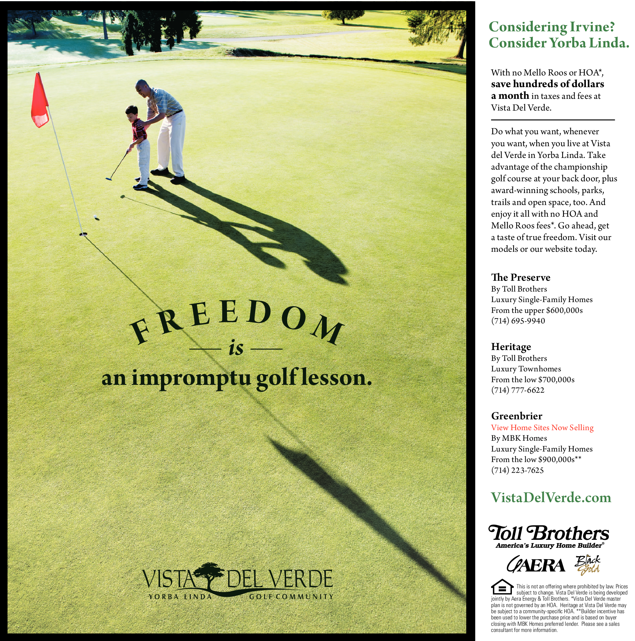 Do what you want, whenever you want, when you live at Vista del Verde in Yorba Linda. Take advantage of the championship golf course at your back door, plus award-winning schools, parks, trails and open space, too. And enjoy it all with no HOA and Mello Roos fees*. Go ahead, get a taste of true freedom. Visit our models or our website today.