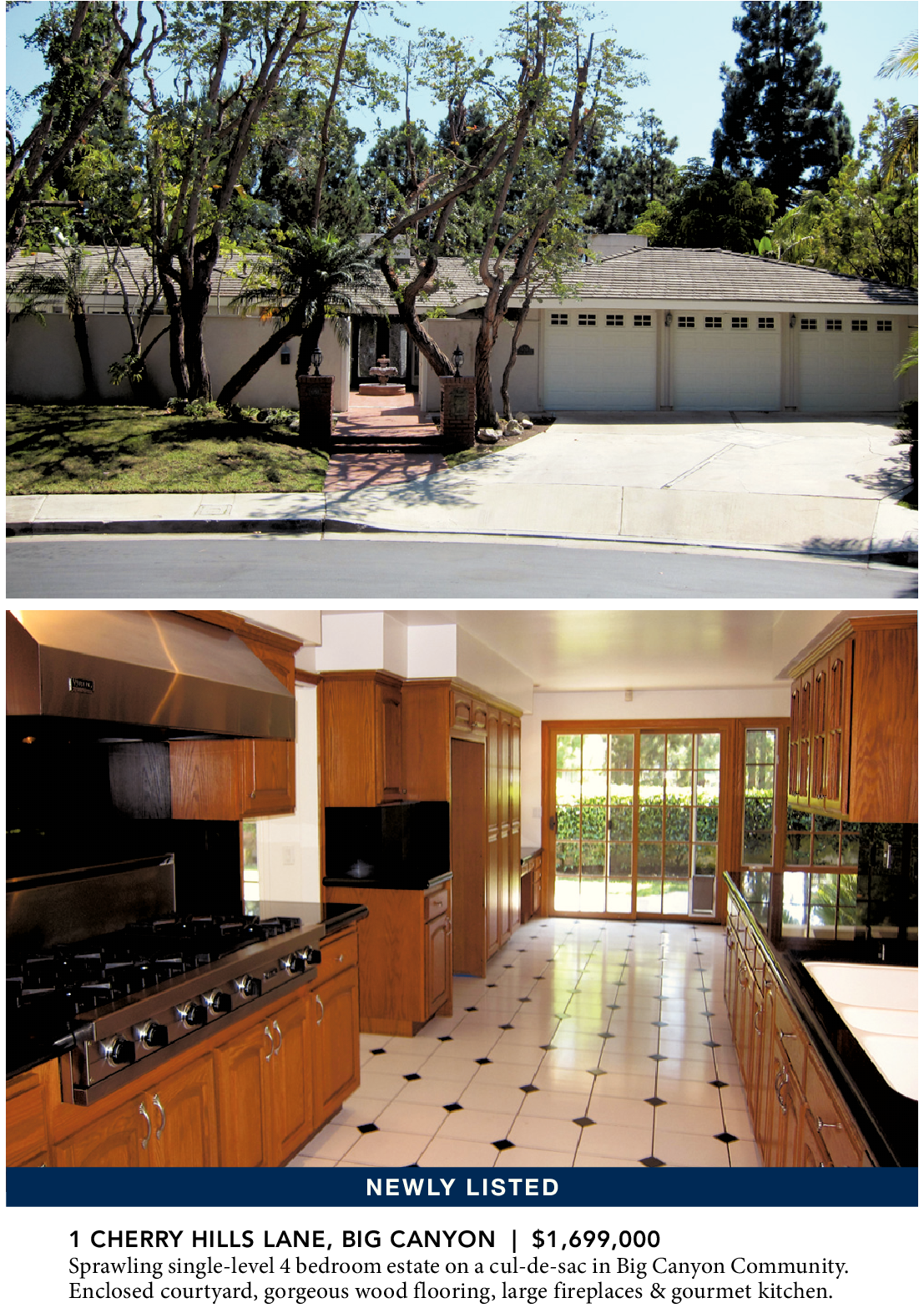 1 CHERRY HILLS LANE, BIG CANYON | $1,699,000 Sprawling single-level 4 bedroom estate on a cul-de-sac in Big Canyon Community. Enclosed courtyard, gorgeous wood flooring, large fireplaces & gourmet kitchen.