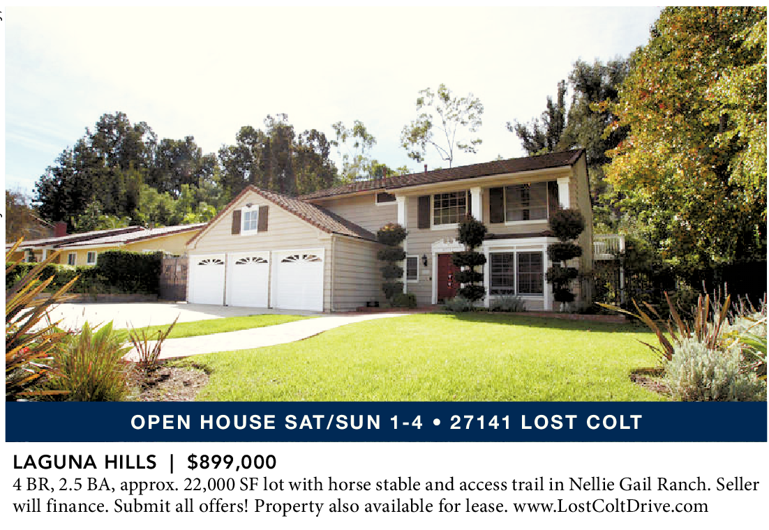 OPEN HOUSE SAT/SUN 1-4 • 27141 LOST COLT LAGUNA HILLS | $899,000 4 BR, 2.5 BA, approx. 22,000 SF lot with horse stable and access trail in Nellie Gail Ranch. Seller will finance. Submit all offers! Property also available for lease. www.LostColtDrive.com
