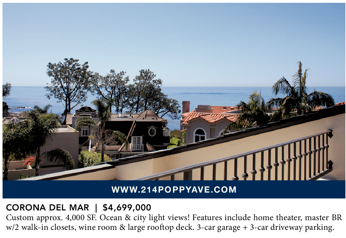 CORONA DEL MAR | $4,699,000 Custom approx. 4,000 SF. Ocean & city light views! Features include home theater, master BR w/2 walk-in closets, wine room & large rooftop deck. 3-car garage + 3-car driveway parking.