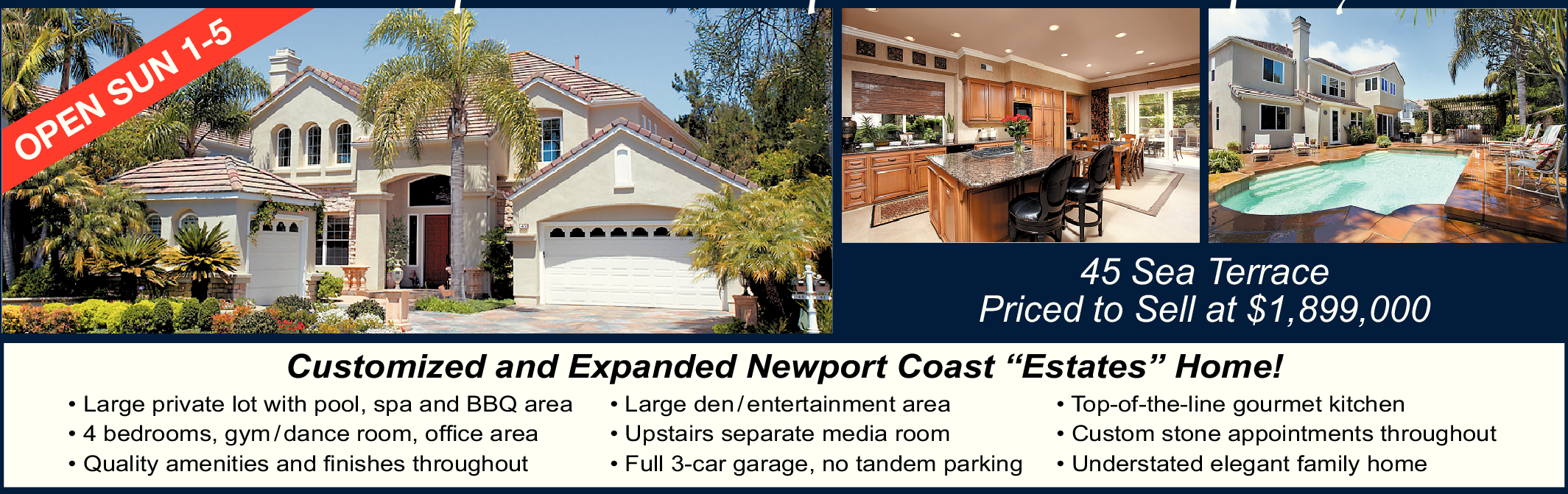 The Weglarz Group..........Real Estate Advice You Can Trust 45 Sea Terrace Priced to Sell at $1,899,000 Customized and Expanded Newport Coast “Estates” Home! • Large private lot with pool, spa and BBQ area • 4 bedrooms, gym / dance room, office area • Quality amenities and finishes throughout • Large den / entertainment area • Upstairs separate media room • Full 3-car garage, no tandem parking • Top-of-the-line gourmet kitchen • Custom stone appointments throughout • Understated elegant family home