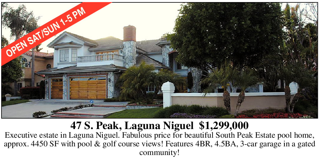 47 S. Peak, Laguna Niguel $1,299,000 Executive estate in Laguna Niguel. Fabulous price for beautiful South Peak Estate pool home, approx. 4450 SF with pool & golf course views! Features 4BR, 4.5BA, 3-car garage in a gated community!