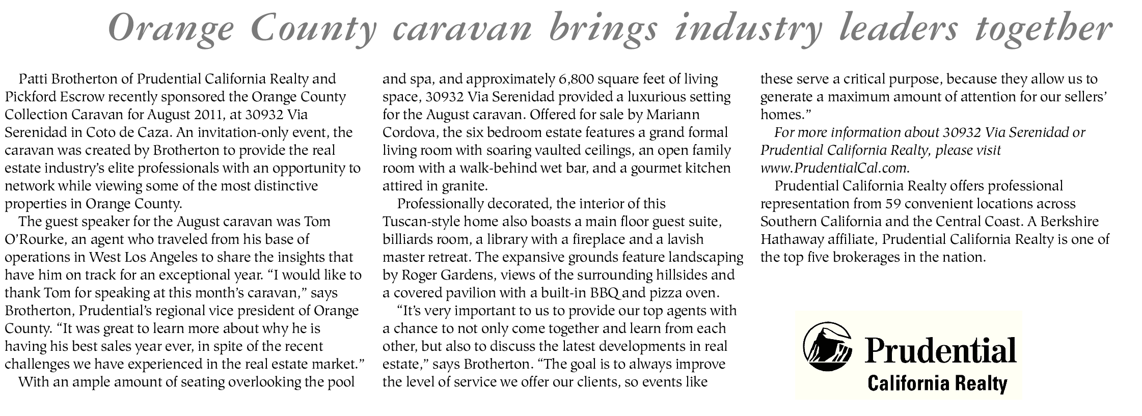 Patti Brotherton of Prudential California Realty and Pickford Escrow recently sponsored the Orange County Collection Caravan for August 2011, at 30932 Via Serenidad in Coto de Caza. An invitation-only event, the caravan was created by Brotherton to provide the real estate industry’s elite professionals with an opportunity to network while viewing some of the most distinctive properties in Orange County.