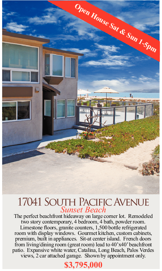 17041 South Pacific Avenue Sunset Beach The perfect beachfront hideaway on large corner lot. Remodeled two story contemporary, 4 bedroom, 4 bath, powder room. Limestone floors, granite counters, 1,500 bottle refrigerated room with display windows. Gourmet kitchen, custom cabinets, premium, built in appliances. Sit-at center island. French doors from living/dining room (great room) lead to 40’x40’ beachfront patio. Expansive white water, Catalina, Long Beach, Palos Verdes views, 2 car attached garage. Shown by appointment only. $3,795,000