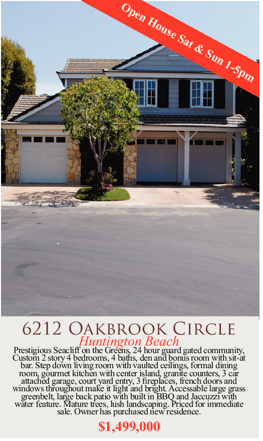 6212 Oakbrook Circle Huntington Beach Prestigious Seacliff on the Greens, 24 hour guard gated community, Custom 2 story 4 bedrooms, 4 baths, den and bonus room with sit-at bar. Step down living room with vaulted ceilings, formal dining room, gourmet kitchen with center island, granite counters, 3 car attached garage, court yard entry, 3 fireplaces, french doors and windows throughout make it light and bright. Accessable large grass greenbelt, large back patio with built in BBQ and Jaccuzzi with water feature. Mature trees, lush landscaping. Priced for immediate sale. Owner has purchased new residence. $1,499,000