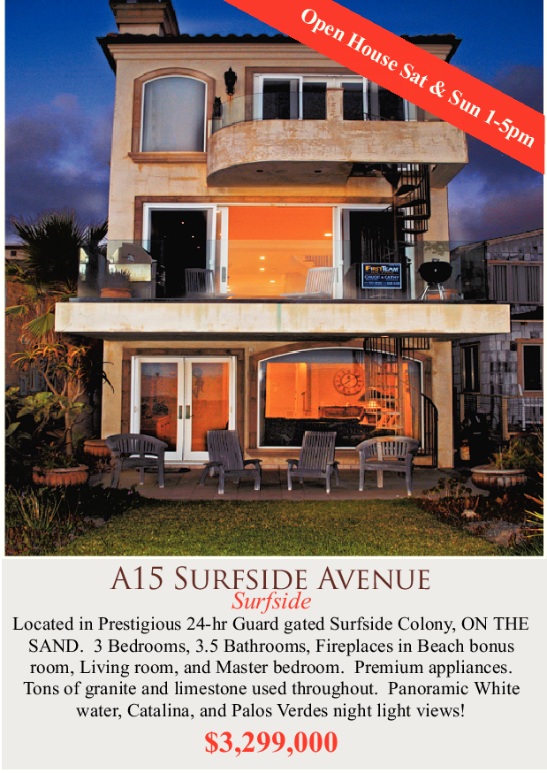 A15 Surfside Avenue Surfside Located in Prestigious 24-hr Guard gated Surfside Colony, ON THE SAND. 3 Bedrooms, 3.5 Bathrooms, Fireplaces in Beach bonus room, Living room, and Master bedroom. Premium appliances. Tons of granite and limestone used throughout. Panoramic White water, Catalina, and Palos Verdes night light views! $3,299,000