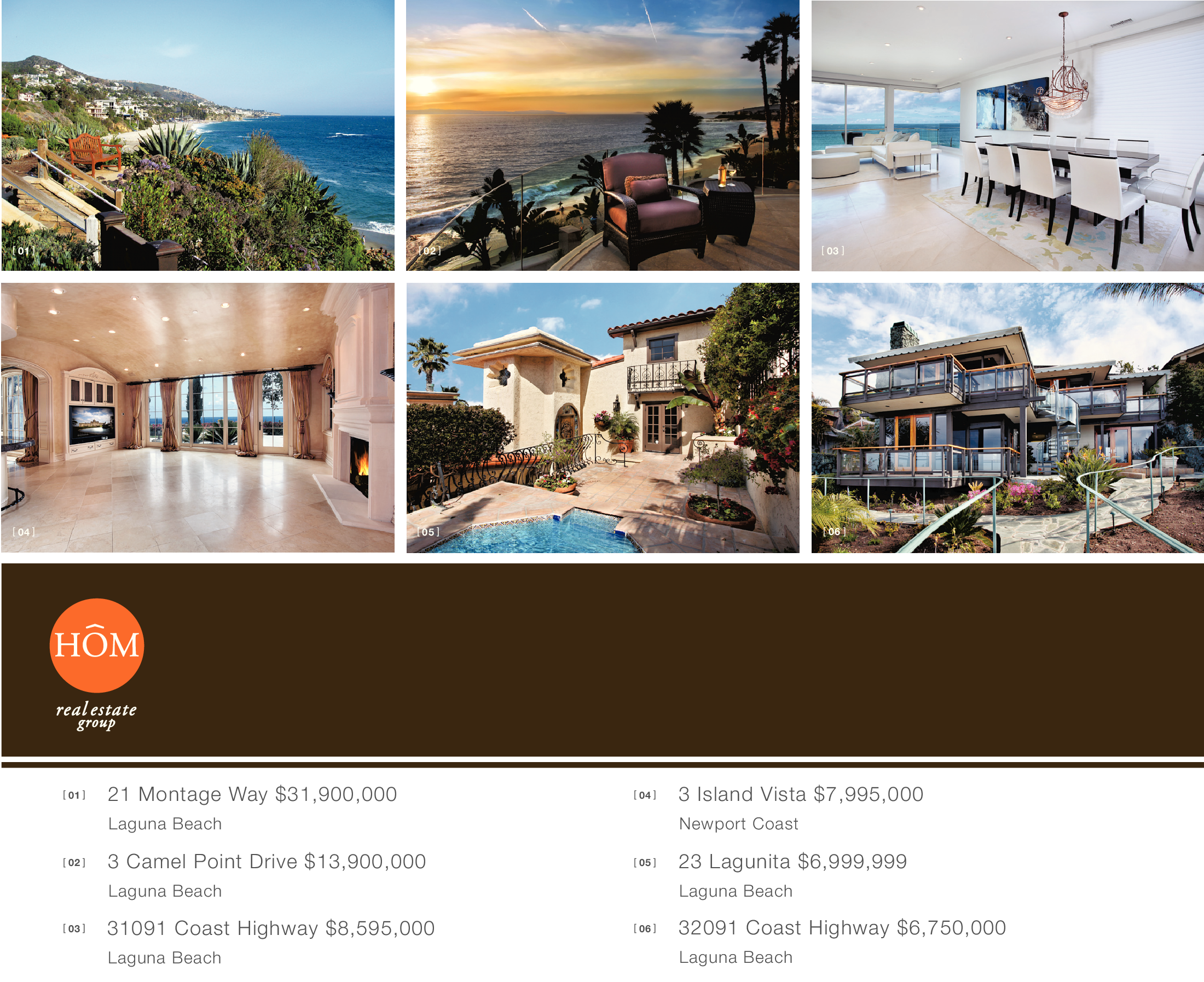 [ 01 ] [ 02 ] [ 03 ] [ 04 ] [ 05 ] [ 06 ] [ 01 ] [ 02 ] [ 03 ] 21 Montage Way $31,900,000 Laguna Beach 3 Camel Point Drive $13,900,000 Laguna Beach 31091 Coast Highway $8,595,000 Laguna Beach 3 Island Vista $7,995,000 Newport Coast [ 04 ] [ 05 ] [ 06 ] 23 Lagunita $6,999,999 Laguna Beach 32091 Coast Highway $6,750,000 Laguna Beach