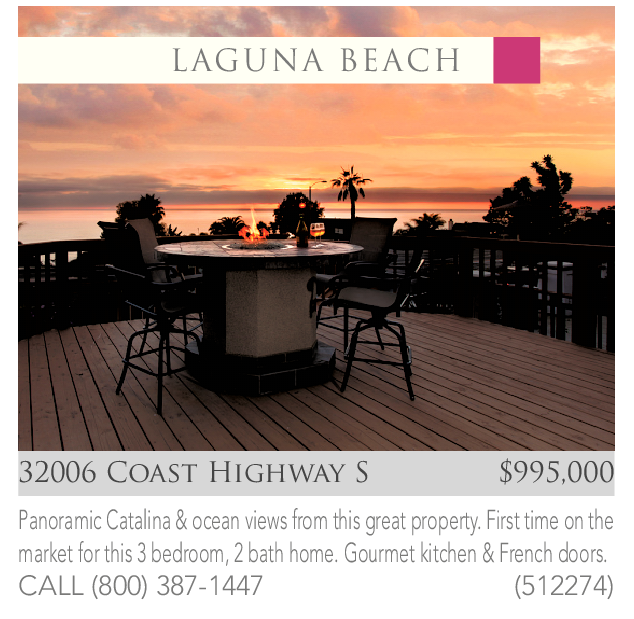 32006 Coast Highway S $995,000 Panoramic Catalina & ocean views from this great property. First time on the market for this 3 bedroom, 2 bath home. Gourmet kitchen & French doors. CALL (800) 387-1447 (512274)
