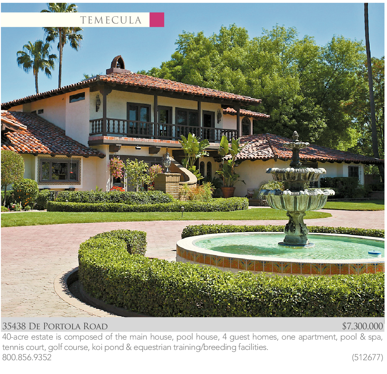 TEMECULA 35438 De Portola Road $7,300,000 40-acre estate is composed of the main house, pool house, 4 guest homes, one apartment, pool & spa, tennis court, golf course, koi pond & equestrian training/breeding facilities. 800.856.9352 (512677) See also