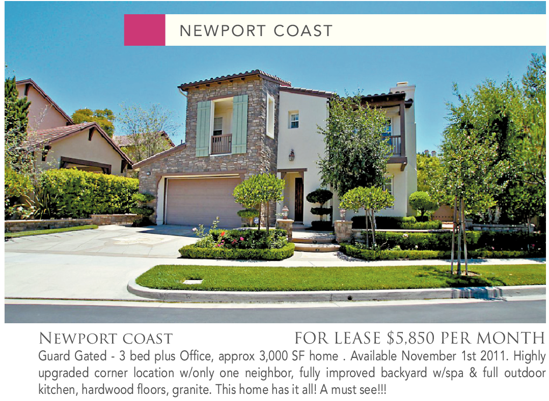 Newport coast FOR LEASE $5,850 PER MONTH Guard Gated - 3 bed plus Office, approx 3,000 SF home . Available November 1st 2011. Highly upgraded corner location w/only one neighbor, fully improved backyard w/spa & full outdoor kitchen, hardwood floors, granite. This home has it all! A must see!!!