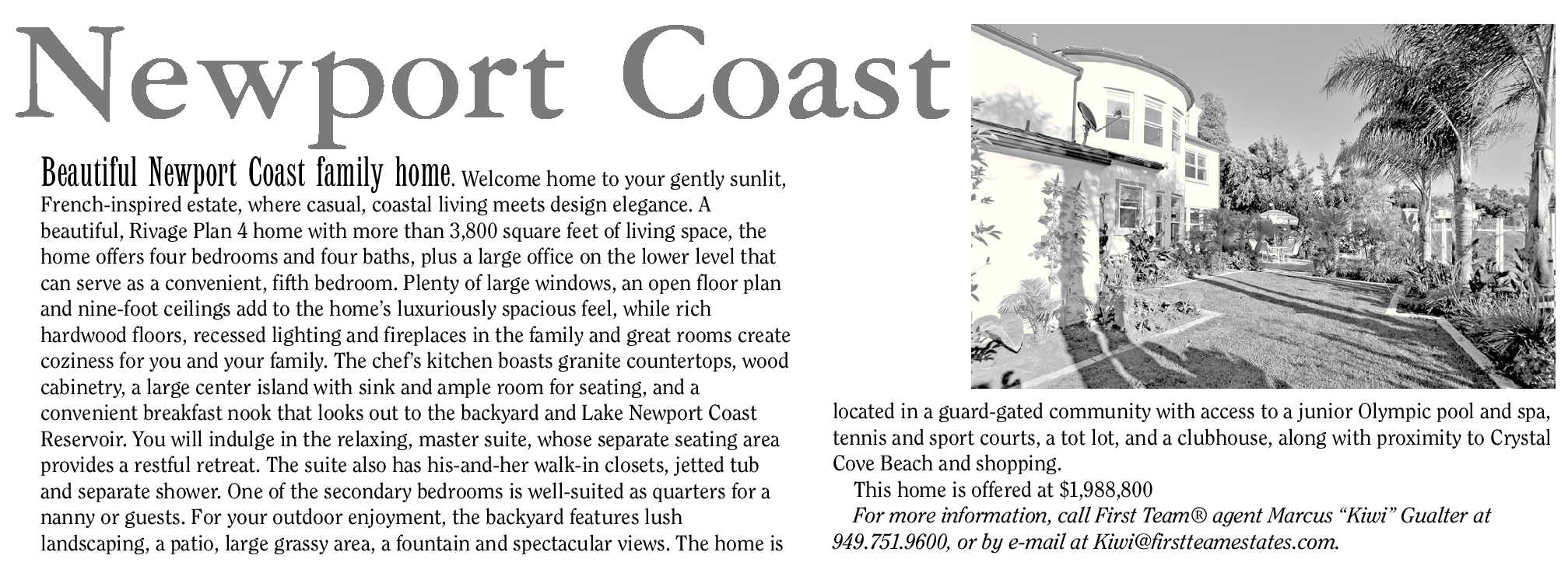Newport Coast Beautiful Newport Coast family home. Welcome home to your gently sunlit, French-inspired estate, where casual, coastal living meets design elegance. A beautiful, Rivage Plan 4 home with more than 3,800 square feet of living space, the home offers four bedrooms and four baths, plus a large office on the lower level that can serve as a convenient, fifth bedroom. Plenty of large windows, an open floor plan and nine-foot ceilings add to the home’s luxuriously spacious feel, while rich hardwood floors, recessed lighting and fireplaces in the family and great rooms create coziness for you and your family. The chef’s kitchen boasts granite countertops, wood cabinetry, a large center island with sink and ample room for seating, and a convenient breakfast nook that looks out to the backyard and Lake Newport Coast Reservoir. You will indulge in the relaxing, master suite, whose separate seating area provides a restful retreat. The suite also has his-and-her walk-in closets, jetted tub and separate shower. One of the secondary bedrooms is well-suited as quarters for a nanny or guests. For your outdoor enjoyment, the backyard features lush landscaping, a patio, large grassy area, a fountain and spectacular views. The home is located in a guard-gated community with access to a junior Olympic pool and spa, tennis and sport courts, a tot lot, and a clubhouse, along with proximity to Crystal Cove Beach and shopping. This home is offered at $1,988,800 For more information, call First Team® agent Marcus “Kiwi” Gualter at 949.751.9600, or by e-mail at Kiwi@firstteamestates.com.