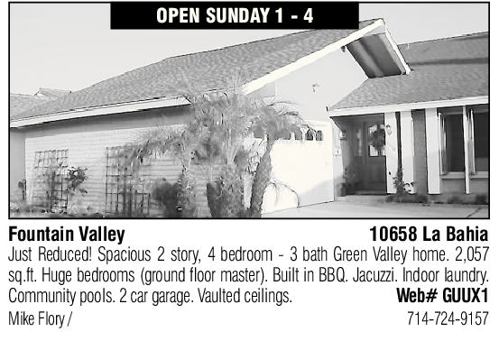 OPEN SUNDAY 1 - 4 Fountain Valley 10658 La Bahia Just Reduced! Spacious 2 story, 4 bedroom - 3 bath Green Valley home. 2,057 sq.ft. Huge bedrooms (ground floor master). Built in BBQ. Jacuzzi. Indoor laundry. Community pools. 2 car garage. Vaulted ceilings. Web# GUUX1 Mike Flory / 714-724-9157