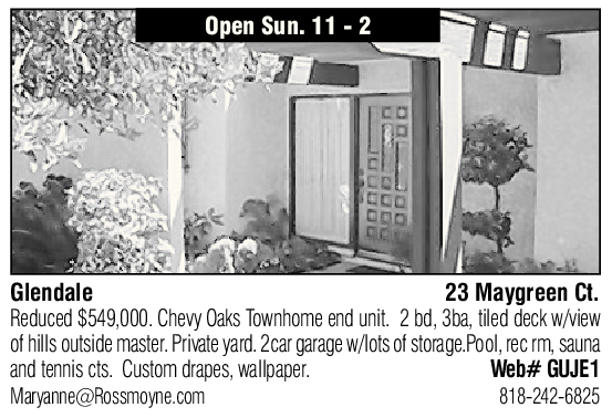 Open Sun. 11 - 2 Glendale 23 Maygreen Ct. Reduced $549,000. Chevy Oaks Townhome end unit. 2 bd, 3ba, tiled deck w/view of hills outside master. Private yard. 2car garage w/lots of storage.Pool, rec rm, sauna and tennis cts. Custom drapes, wallpaper. Web# GUJE1 Maryanne@Rossmoyne.com 818-242-6825