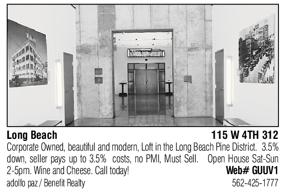 Long Beach 115 W 4TH 312 Corporate Owned, beautiful and modern, Loft in the Long Beach Pine District. 3.5% down, seller pays up to 3.5% costs, no PMI, Must Sell. Open House Sat-Sun 2-5pm. Wine and Cheese. Call today! Web# GUUV1 adolfo paz / Benefit Realty 562-425-1777