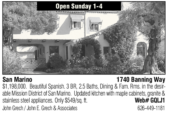 Open Sunday 1-4 San Marino 1740 Banning Way $1,198,000. Beautiful Spanish. 3 BR, 2.5 Baths, Dining & Fam. Rms. in the desirable Mission District of San Marino. Updated kitchen with maple cabinets, granite & stainless steel appliances. Only $549/sq. ft. Web# GQLJ1 John Grech / John E. Grech & Associates 626-449-1181 See also