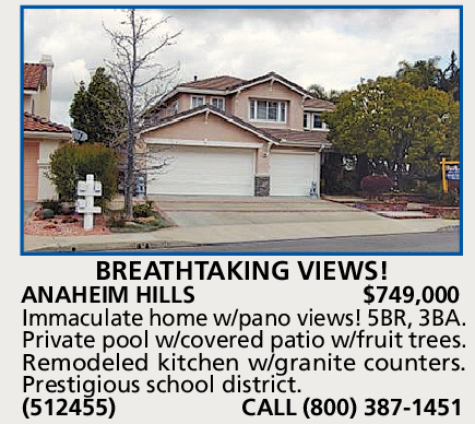 ANAHEIM HILLS $749,000 Immaculate home w/pano views! 5BR, 3BA. Private pool w/covered patio w/fruit trees. Remodeled kitchen w/granite counters. Prestigious school district. (512455) CALL (800) 387-1451