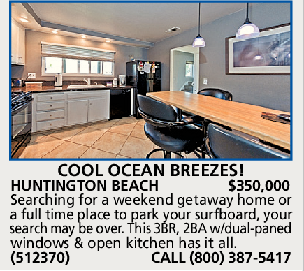 HUNTINGTON BEACH $350,000 Searching for a weekend getaway home or a full time place to park your surfboard, your search may be over. This 3BR, 2BA w/dual-paned windows & open kitchen has it all. (512370) CALL (800) 387-5417