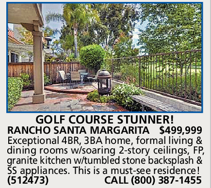 RANCHO SANTA MARGARITA $499,999 Exceptional 4BR, 3BA home, formal living & dining rooms w/soaring 2-story ceilings, FP, granite kitchen w/tumbled stone backsplash & SS appliances. This is a must-see residence! (512473) CALL (800) 387-1455