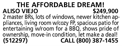 THE AFFORDABLE DREAM! ALISO VIEJO $249,900 2 master BRs, lots of windows, newer kitchen appliances, living room w/cozy FP, spacious patio for entertaining w/room for a BBQ, shows pride of ownership, move-in condition, let make a deal! (512297) CALL (800) 387-1455