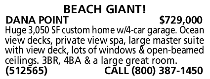 DANA POINT $729,000 Huge 3,050 SF custom home w/4-car garage. Ocean view decks, private view spa, large master suite with view deck, lots of windows & open-beamed ceilings. 3BR, 4BA & a large great room. (512565) CALL (800) 387-1450