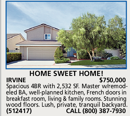 IRVINE $750,000 Spacious 4BR with 2,532 SF. Master w/remodeled BA, well-planned kitchen, French doors in breakfast room, living & family rooms. Stunning wood floors. Lush, private, tranquil backyard. (512417) CALL (800) 387-7930