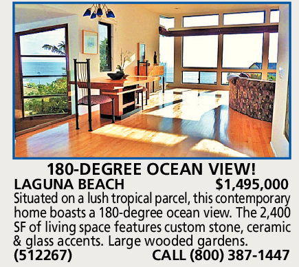 180-DEGREE OCEAN VIEW! LAGUNA BEACH $1,495,000 Situated on a lush tropical parcel, this contemporary home boasts a 180-degree ocean view. The 2,400 SF of living space features custom stone, ceramic & glass accents. Large wooded gardens. (512267) CALL (800) 387-1447