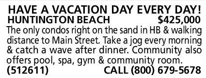 HAVE A VACATION DAY EVERY DAY! HUNTINGTON BEACH $425,000 The only condos right on the sand in HB & walking distance to Main Street. Take a jog every morning & catch a wave after dinner. Community also offers pool, spa, gym & community room. (512611) CALL (800) 679-5678