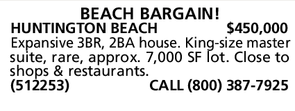 HUNTINGTON BEACH $450,000 Expansive 3BR, 2BA house. King-size master suite, rare, approx. 7,000 SF lot. Close to shops & restaurants. (512253) CALL (800) 387-7925