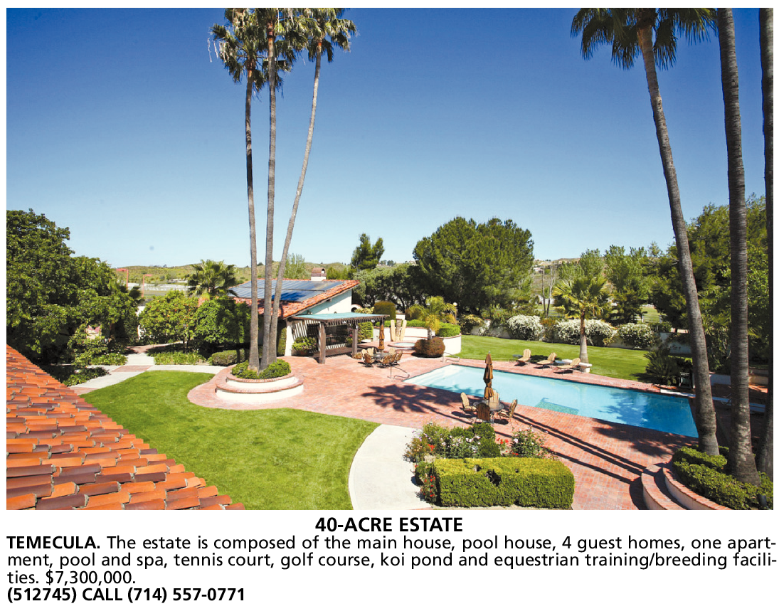 40-ACRE ESTATE TEMECULA. The estate is composed of the main house, pool house, 4 guest homes, one apartment, pool and spa, tennis court, golf course, koi pond and equestrian training/breeding facilities. $7,300,000.