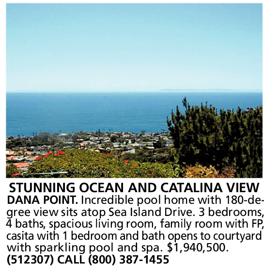 STUNNING OCEAN AND CATALINA VIEW DANA POINT. Incredible pool home with 180-degree view sits atop Sea Island Drive. 3 bedrooms, 4 baths, spacious living room, family room with FP, casita with 1 bedroom and bath opens to courtyard with sparkling pool and spa. $1,940,500. (512307) CALL (800) 387-1455