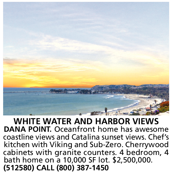 WHITE WATER AND HARBOR VIEWS DANA POINT. Oceanfront home has awesome coastline views and Catalina sunset views. Chef’s kitchen with Viking and Sub-Zero. Cherrywood cabinets with granite counters. 4 bedroom, 4 bath home on a 10,000 SF lot. $2,500,000. (512580) CALL (800) 387-1450