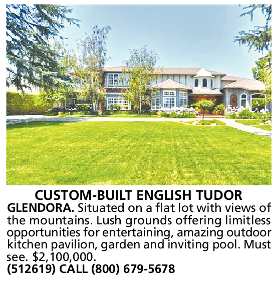 CUSTOM-BUILT ENGLISH TUDOR GLENDORA. Situated on a flat lot with views of the mountains. Lush grounds offering limitless opportunities for entertaining, amazing outdoor kitchen pavilion, garden and inviting pool. Must see. $2,100,000. (512619) CALL (800) 679-5678