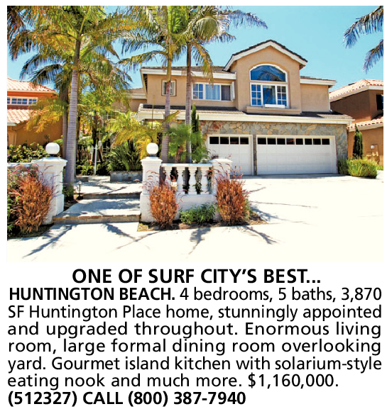 ONE OF SURF CITY’S BEST... HUNTINGTON BEACH. 4 bedrooms, 5 baths, 3,870 SF Huntington Place home, stunningly appointed and upgraded throughout. Enormous living room, large formal dining room overlooking yard. Gourmet island kitchen with solarium-style eating nook and much more. $1,160,000. (512327) CALL (800) 387-7940