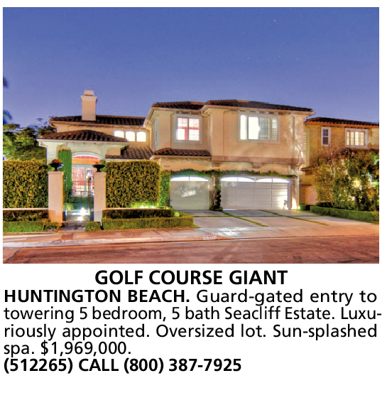 GOLF COURSE GIANT HUNTINGTON BEACH. Guard-gated entry to towering 5 bedroom, 5 bath Seacliff Estate. Luxuriously appointed. Oversized lot. Sun-splashed spa. $1,969,000. (512265) CALL (800) 387-7925